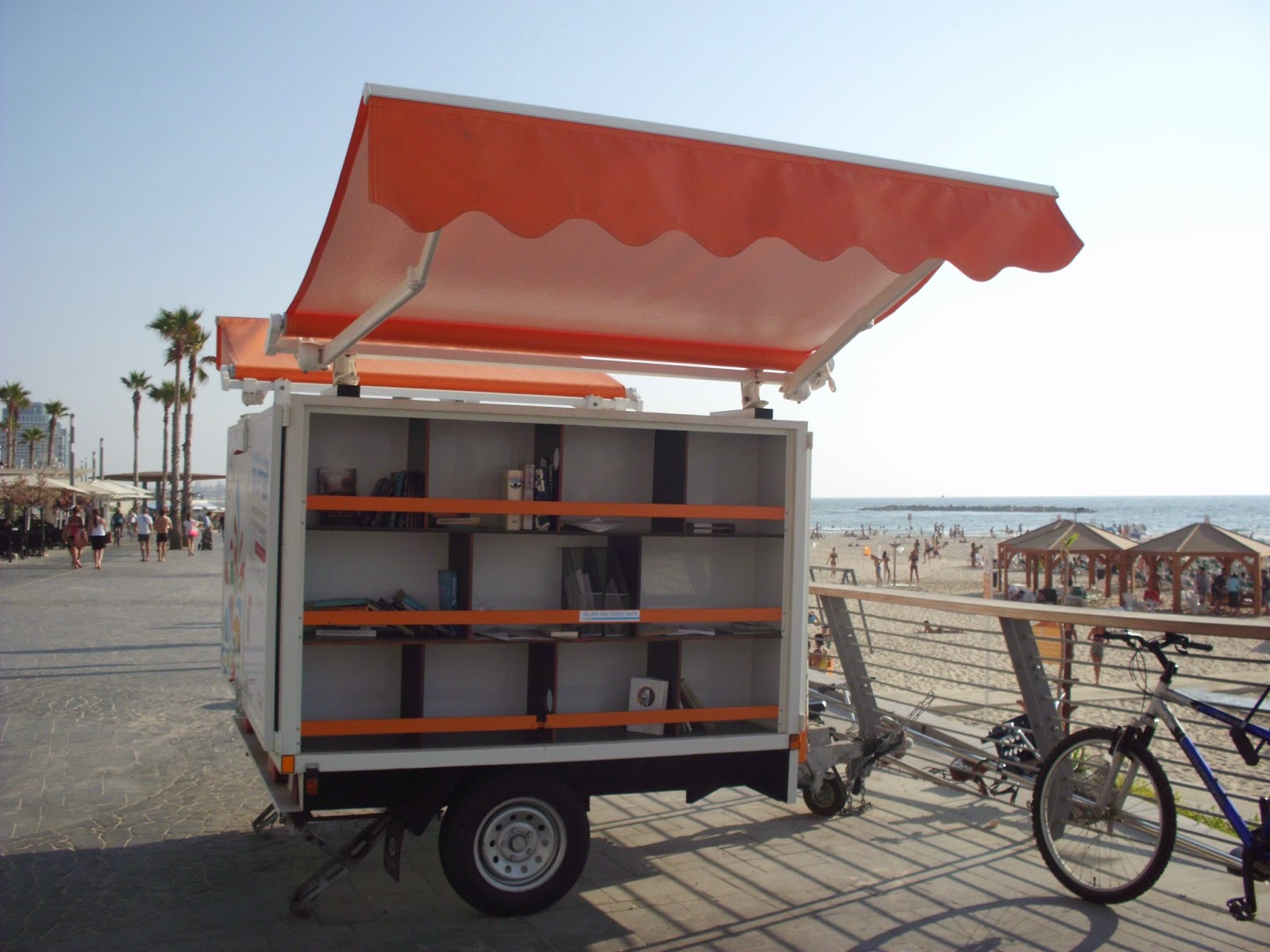 Die Idee hinter den Mini-Bibliotheken entstand 2013 und begann mit einem einzigen Wagen. Dieser sollte dafür sorgen, dass Bücher wieder für die Menschen zugänglicher sind. Sie sollen so überall präsent sein, um noch mehr Leute zum Lesen zu motivieren. Und das ganz ohne Zwang oder Aufsicht. Es gibt niemanden der die Bücher laut anpreist, keine Bibliothekarin oder Polizisten der schaut, dass auch alles wieder an seinen Platz zurückgelegt wird. Leider waren die Regalbretter daher schon ziemlich leer geräumt, als wir da waren. Aber ich habe beim Recherchieren heraus gefunden, dass sie wohl immer wieder aufgefüllt werden. Wer lieber digital liest, wird ebenfalls fündig. Denn am Strand von Tel Aviv gibt es kostenloses Wi-Fi. So gelangt man auf die von „Free TLV“ über die man sich ebenfalls kostenfrei neues Lesefutter runterladen kann. Ich finde das wirklich eine tolle Idee!